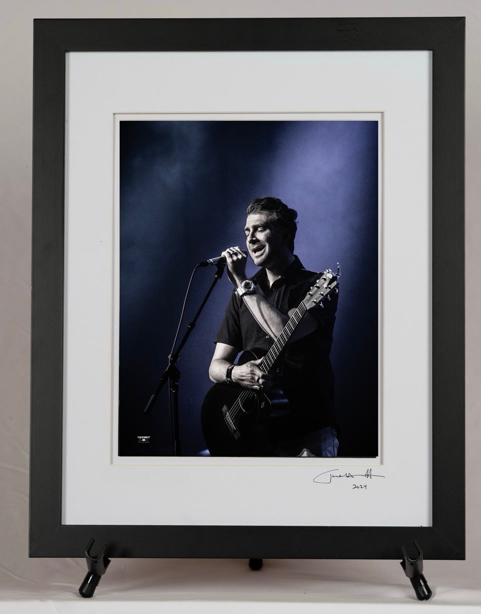 Framed color tinted photo printed on metallic paper with a simple 1 1/4” molding black wood frame, double matted with glass.